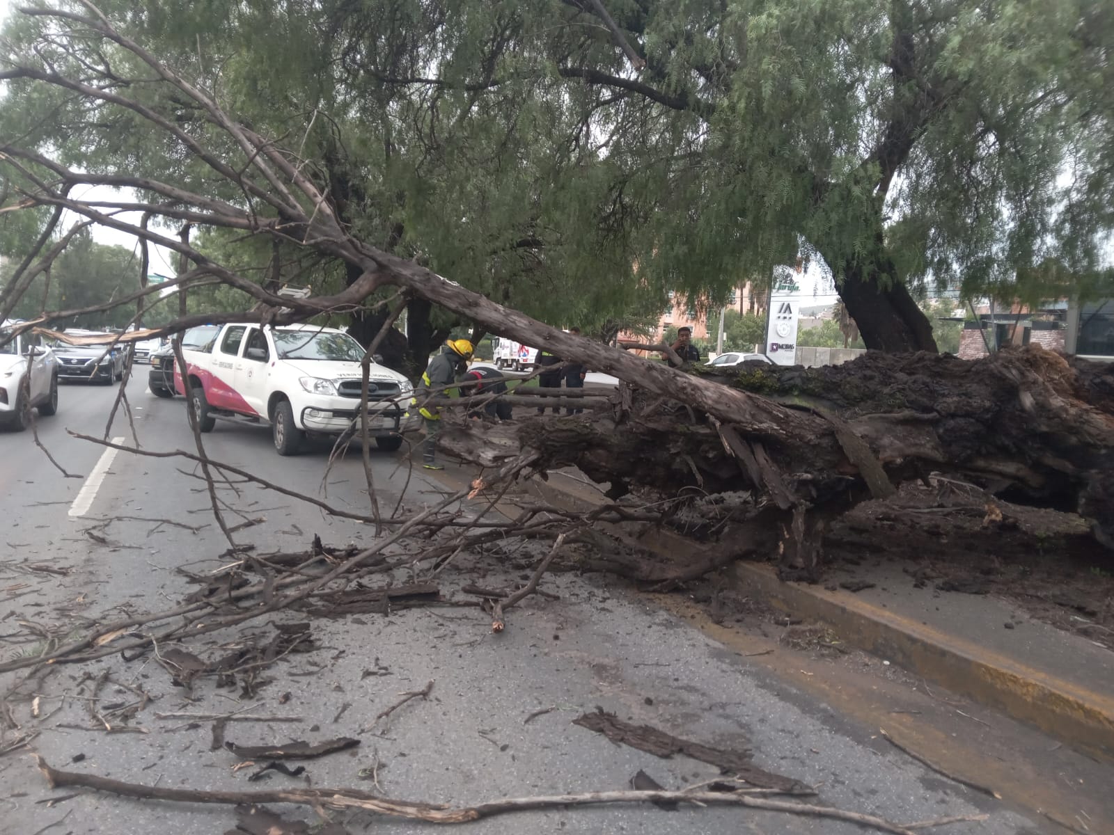 Efectivos de la Coordinación Estatal de Protección Civil (CEPC), bajo la dirección de Jorge Gallardo Álvarez, atendieron este miercoles un reporte recibido a través del sistema de emergencias 911, en el que se alertaba sobre la caída de un árbol de aproximadamente seis metros de altura sobre el Eje Metropolitano.