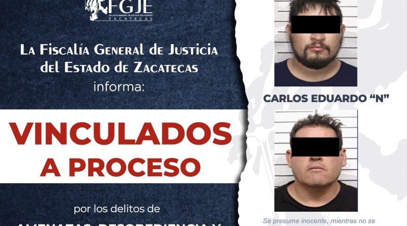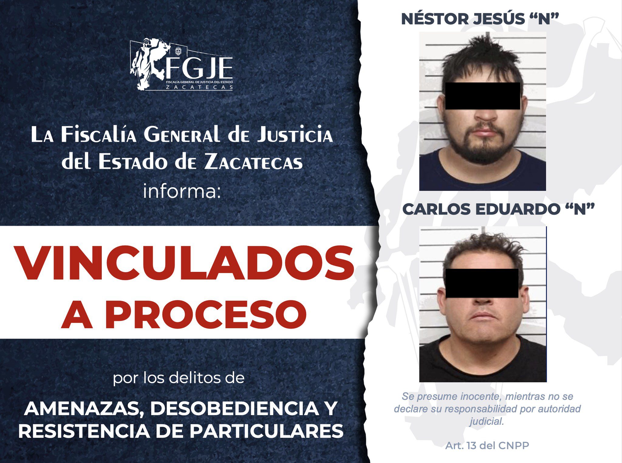 Zacatecas, Zac.– La Fiscalía General de Justicia del Estado, a través de la Fiscalía Especializada en Delitos de Alto Impacto, obtuvo la vinculación a proceso de Néstor “N” y Carlos “N”, por los delitos de amenazas, desobediencia y resistencia de particulares.