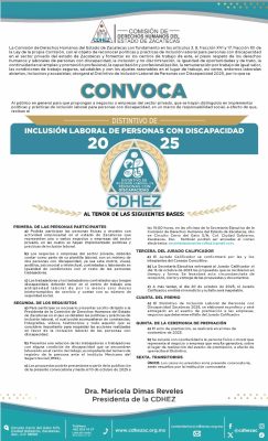 La Comisión de Derechos Humanos del Estado de Zacatecas (CDHEZ), a través de su Presidenta, Dra. Maricela Dimas Reveles, invita al público en general a proponer a negocios y empresas del sector privado que destaquen por sus políticas y prácticas de inclusión laboral de personas con discapacidad, para que participen en la edición 2025 del Distintivo de Inclusión Laboral de Personas con Discapacidad.