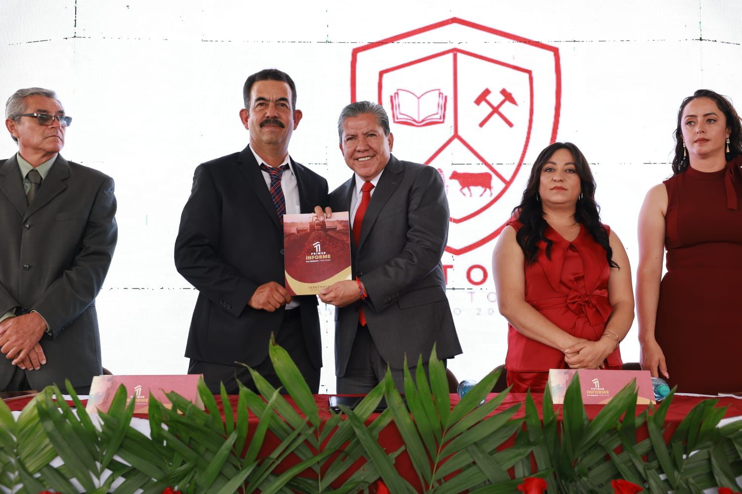 El Presidente Municipal de Tepetongo, Filiberto Venegas Nava, entregó al Gobernador David Monreal Ávila el libro que contiene el Informe de labores, y agradeció el apoyo otorgado al municipio en este primer año de la administración.