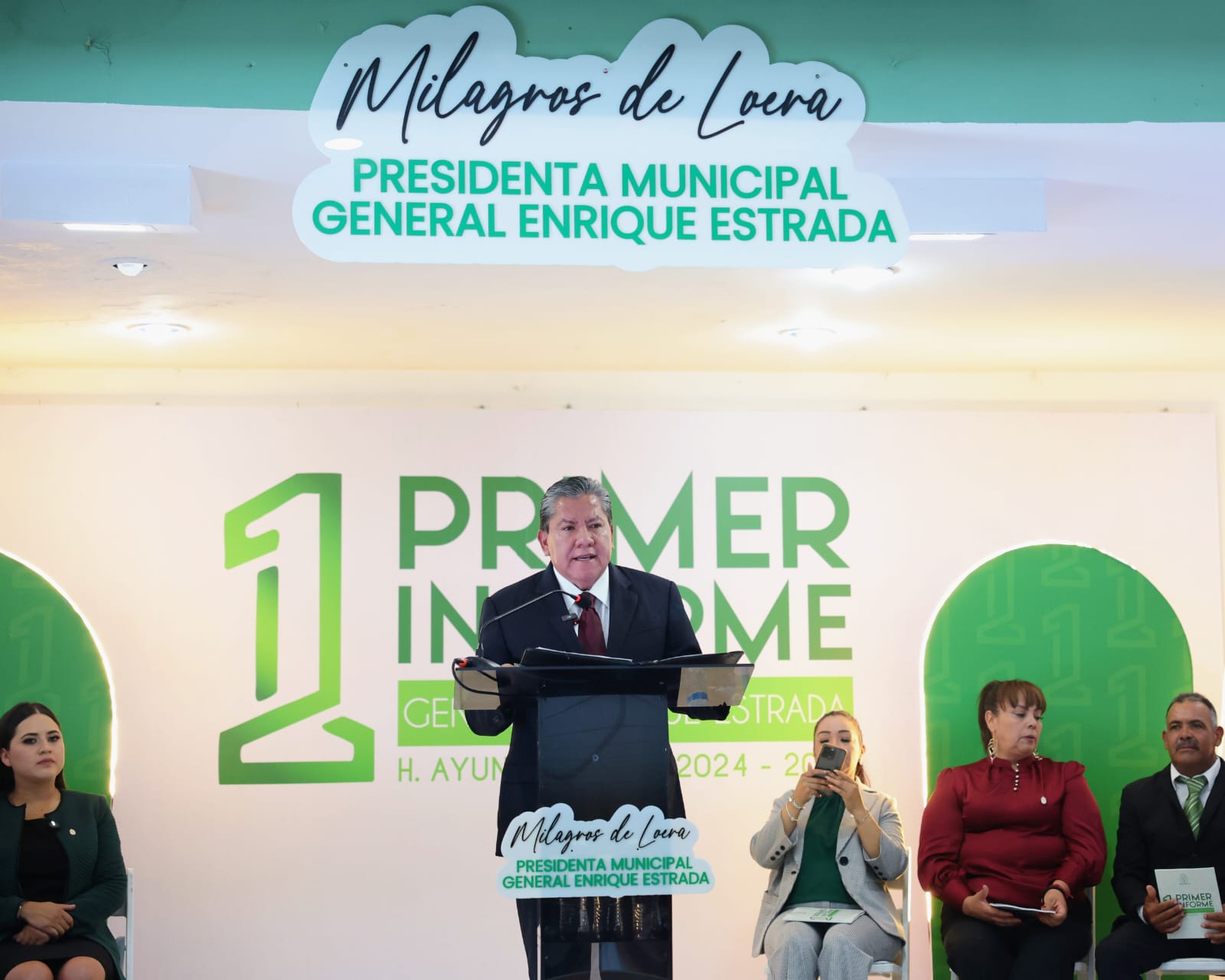 General Enrique Estrada, Zac., 13 de septiembre de 2025.- El Gobernador David Monreal reafirmó su compromiso con el desarrollo y bienestar del municipio de General Enrique Estrada, luego de acudir como invitado especial al primer informe de labores de la alcaldesa, Milagros de Loera Rodríguez.