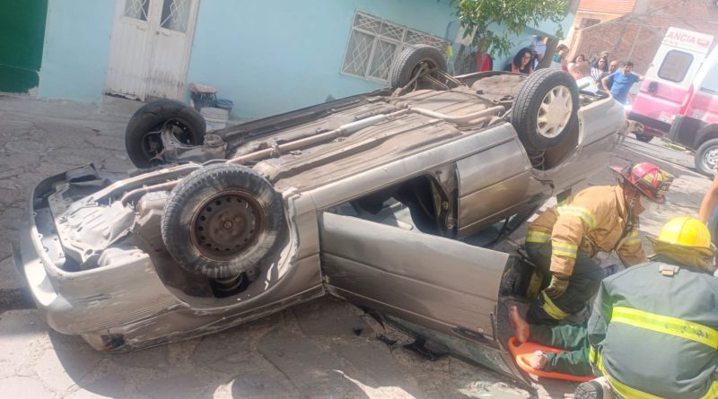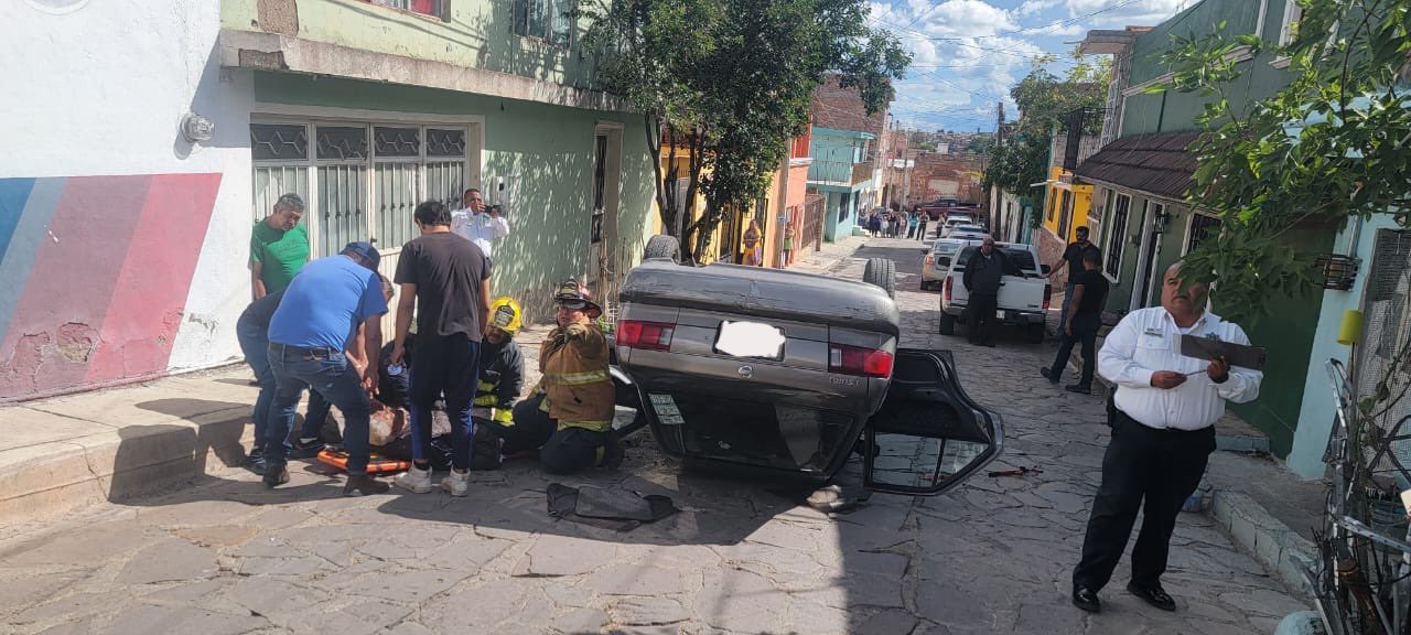 Guadalupe, Zacatecas.– Elementos de la Coordinación Estatal de Protección Civil atendieron un accidente vehicular tipo volcadura registrado en el cruce de las calles Aurora y Telégrafos, en la zona centro de este municipio.