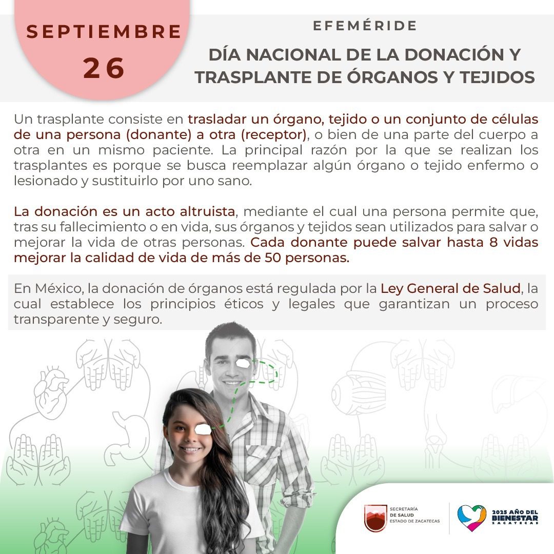 - Cada 26 de septiembre se conmemora el Día Nacional de la Donación y Trasplante de Órganos y Tejidos