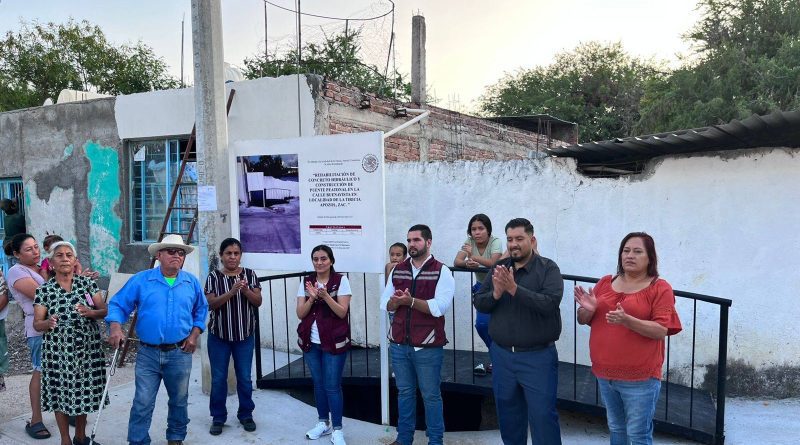 Apozol, Zac.– La alcaldesa Gabriela Arellano Quezada encabezó la entrega de la obra de rehabilitación con concreto hidráulico y construcción de un puente peatonal en la calle Buenavista de la comunidad La Tiricia, atendiendo así una de las demandas más sentidas de los habitantes.