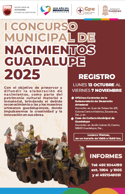 Guadalupe, Zac., 13 octubre de 2025.- Con el objetivo de preservar y difundir la elaboración de nacimientos como parte del patrimonio cultural material e inmaterial de Zacatecas, el Gobierno del Estado, encabezado por el mandatario David Monreal Ávila, a través de la Secretaría de Economía y la Subsecretaría de Desarrollo Artesanal, en coordinación con el Ayuntamiento de Guadalupe, convoca a las y los artesanos a participar en la primera edición del Concurso Municipal de Nacimientos Guadalupe 2025.
