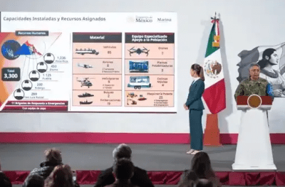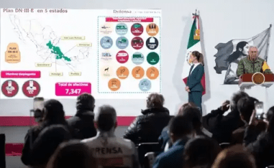 El secretario de la Defensa Nacional, Ricardo Trevilla Trejo, destacó que en atención a la emergencia se desplegó en los cinco estados el Plan DN-III-E con 7 mil 347 efectivos del Ejército, la Fuerza Aérea, la Guardia Nacional; así como siete aeronaves de ala rotativa, una cocina móvil con capacidad para dar 10 mil raciones diarias, tres plantas potabilizadoras con capacidad de abastecer 10 mil litros diarios de agua potable, células de intendencia, que cada una puede abastecer 2 mil 500 raciones diarias, 40 unidades de maquinaria pesada, 21 volteos para la reparación de caminos, 58 vehículos para apoyar a la población civil y también para recoger toda la basura, cuatro hospitales de zona, dos puestos de mando móviles con comunicaciones estratégicas, 11 lanchas, 6 tractocamiones, 16 drones, 17 binomios canófilos y 10 células de sanidad.