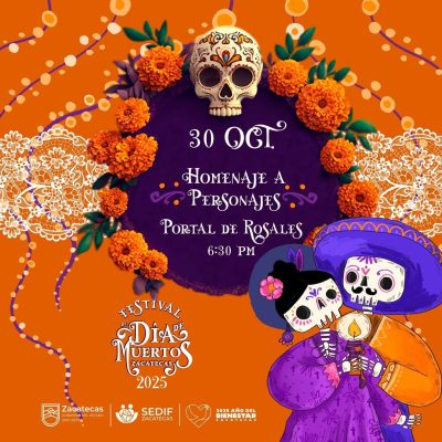 Zacatecas, Zac., 13 de octubre de 2025.- Como parte de las actividades del Festival de Día de Muertos Zacatecas 2025, el Gobierno del Estado, encabezado por el mandatario David Monreal Ávila, rendirá homenaje a personajes destacados de la vida cotidiana de la entidad, el 30 de octubre, a las 18:30 horas, donde se reconocerá su legado y aportaciones a la sociedad zacatecana.