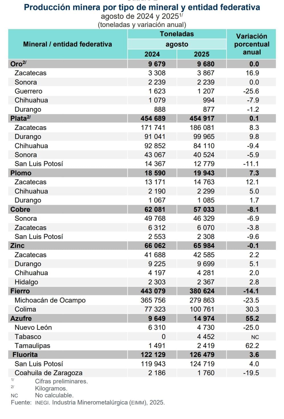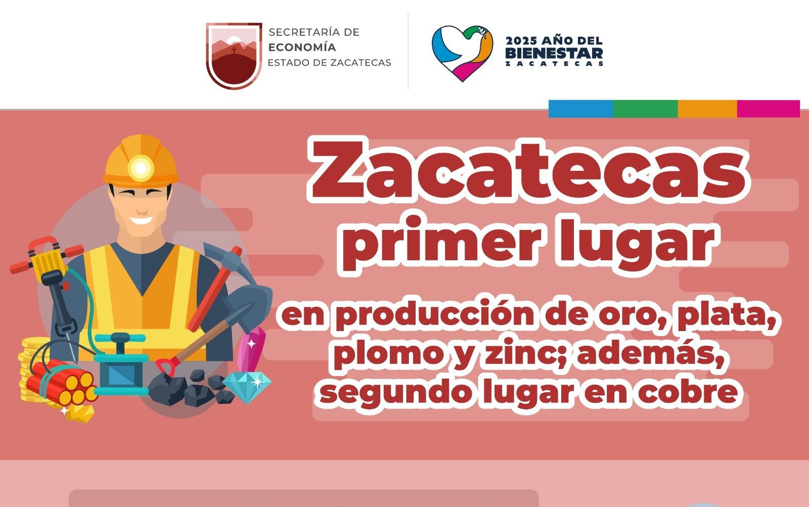 Zacatecas, Zac., 22 octubre de 2025.- Zacatecas continúa su consolidación como el corazón minero de México, al mantenerse como líder nacional en la producción de oro, plata, plomo y zinc, y ocupar el segundo lugar en cobre, de acuerdo con los datos más recientes publicados por el Instituto Nacional de Estadística y Geografía (INEGI), correspondientes a la producción minera de agosto de 2025.