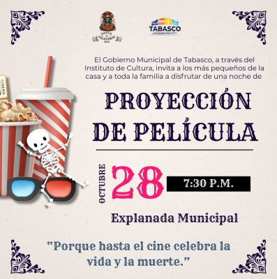 Tabasco, Zacatecas. – El Gobierno Municipal de Tabasco, a través del Instituto de Cultura, invita a la población a disfrutar de una noche de cine familiar en el marco del Festival de Calaveras 2025 “Porque pa’ morir nacimos”.