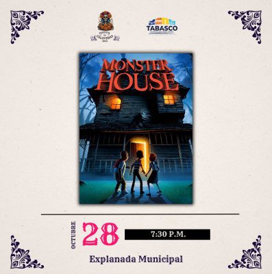Como parte de las actividades culturales, se proyectará la película Monster House, una historia animada llena de aventuras y misterio ideal para compartir con los más pequeños del hogar. La función se llevará a cabo el lunes 28 de octubre a las 7:30 de la noche en la Explanada Municipal.