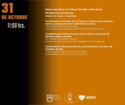 Para el viernes 31 se abordarán temas como letanías de la Virgen a la hora de la muerte, rezos y estampas en la tradición funeraria; el lento funeral de la vida en la poesía de Ramón López Velarde y Muerte siniestra, acercamiento a la obra de Amparo Dávila.