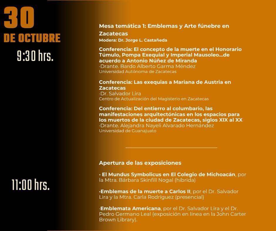 El Cronista del Estado, Federico Priapo Chew Araiza, informó que se tienen programadas, para el día 30, varias conferencias en las que se abordarán temas como el concepto de la muerte en el honorario túmulo, pompa exequial e imperial mausoleo; las exequias a Mariana de Austria en Zacatecas y del Entierro al columbario, las manifestaciones arquitectónicas en los espacios para los muertos de la ciudad de Zacatecas siglo XIX al XX.