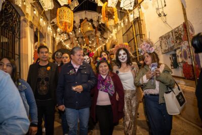 Zacatecas, Zac., 30 de octubre de 2025.- Acompañado por la Presidenta del Sistema Estatal para el Desarrollo Integral de la Familia (SEDIF), Sara Hernández, y la Secretaria de Cultura de Veracruz, Xóchitl Molina González, el Gobernador David Monreal Ávila encabezó el corte del listón y el recorrido inaugural de la decoración de arcos, fachadas y espacios del Centro Histórico, además de un homenaje a personajes zacatecanos de la vida cotidiana.
