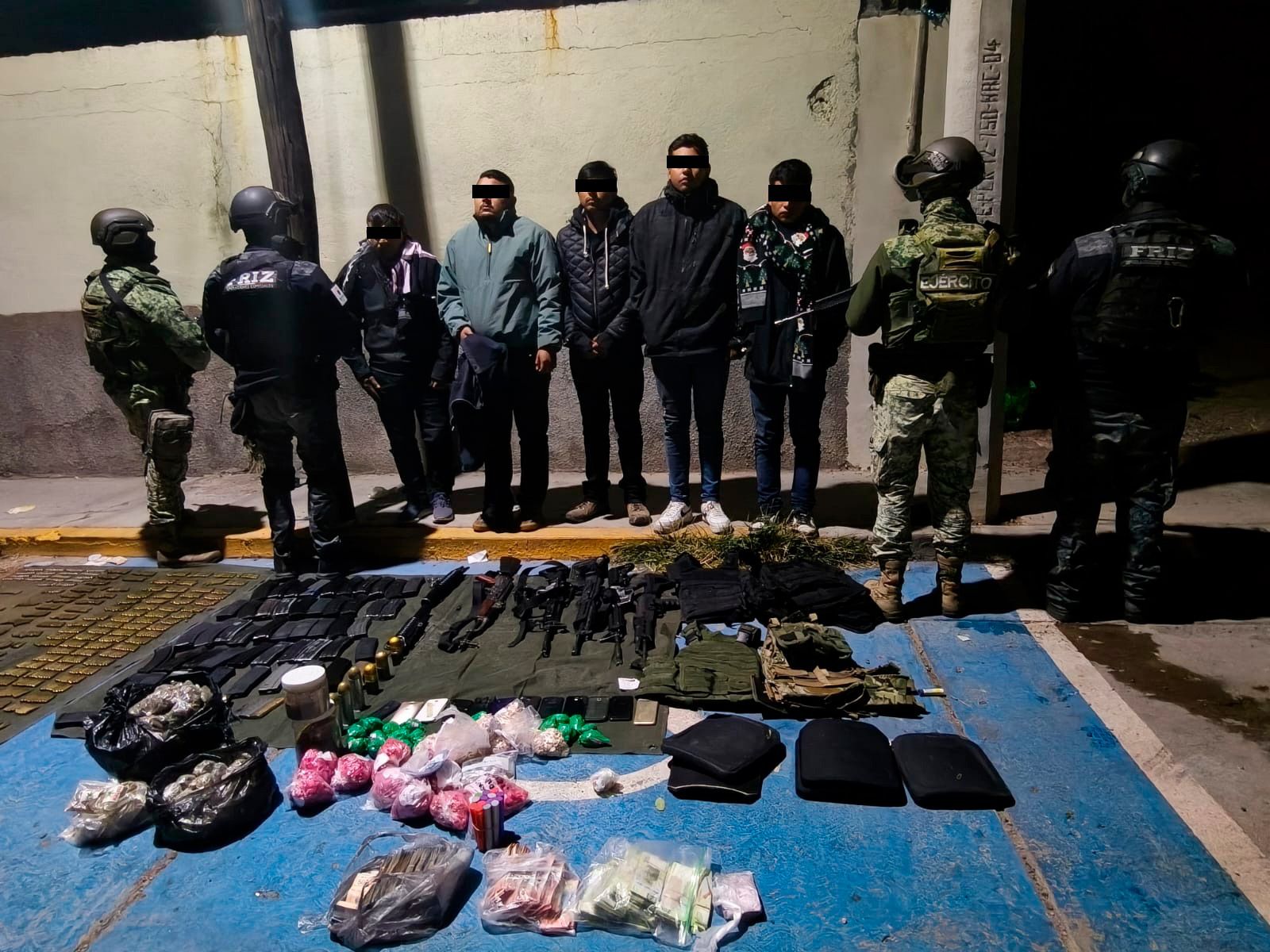 En una acción conjunta, personal del Ejército Mexicano, la Guardia Nacional, la Fuerza de Reacción Inmediata Zacatecas (FRIZ) y la Policía de Investigación de la Fiscalía General de Justicia del Estado (FGJEZ), realizaron un operativo que dejó como resultado la detención de cinco personas identificadas como Luis Alberto N., de 21 años de edad, proveniente de Jalisco; Antonio N., de 22 años, originario de Nayarit; Daniel N., de 22 años, de Chiapas; Jesús Enrique N., de 22 años, del Estado de México y José Ángel N., de 27 años, de Zacatecas.