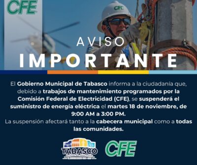 Tabasco, Zacatecas. – El Gobierno Municipal de Tabasco informó que la Comisión Federal de Electricidad (CFE) llevará a cabo este martes 18 de noviembre una serie de trabajos de mantenimiento en la red eléctrica, con el propósito de garantizar un servicio más estable y de mayor calidad para la población.