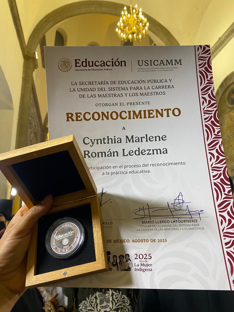 El reconocimiento lo recibió de manos del Secretario de Educación Pública, Mario Delgado Carrillo, quien entregó preseas a 3 mil 843 maestras y maestros de Educación Básica y Media Superior de las 32 entidades del país, distinguidos por su innovación pedagógica y su contribución al aprendizaje y al trabajo comunitario, en congruencia con los principios de la Nueva Escuela Mexicana (NEM).