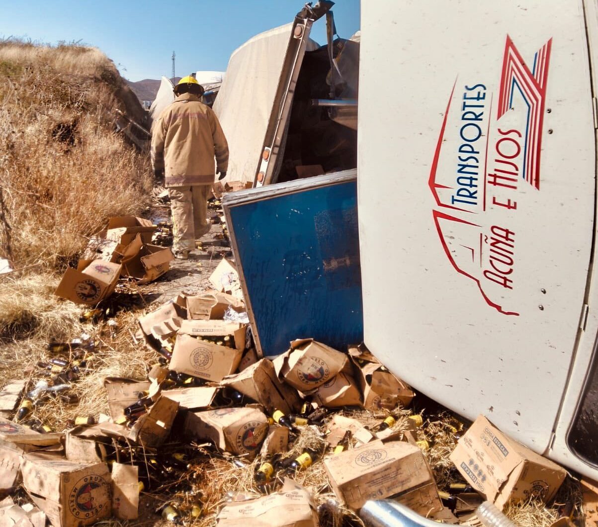 En la carretera 45, a la altura de Sauceda de la Borda, se registró la volcadura de un tráiler que transportaba cerca de 60 toneladas de cerveza. La unidad, que viajaba con doble remolque, quedó recostada sobre su costado derecho, ocasionando afectación en la circulación.