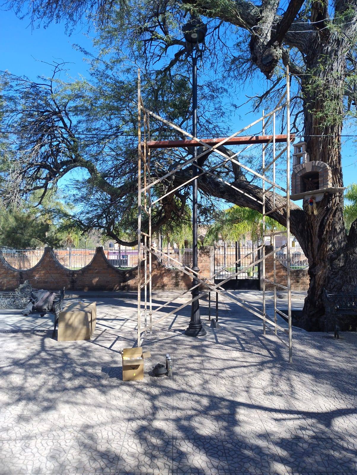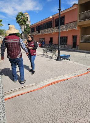 Las acciones revisadas corresponden a la tercera etapa del andador peatonal en la comunidad de La Purísima y a la rehabilitación del alumbrado público en la plaza de San Miguel, donde se instalan luminarias LED como parte del proceso de modernización.