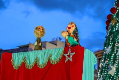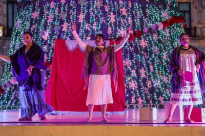 Zacatecas, Zac., 9 de diciembre de 2025.- En el marco de la programación artística del Festival de Luces 2025, que el Gobierno del Estado realiza, a través del Instituto Zacatecano de Cultura (IZC) “Ramón López Velarde” y el Sistema Estatal para el Desarrollo Integral de la Familia (SEDIF), tuvo lugar la puesta en escena “Chona, China, Chayo y los diablos suatos”, una divertida pastorela presentada por Alquimia Teatral, en Plaza de Armas.