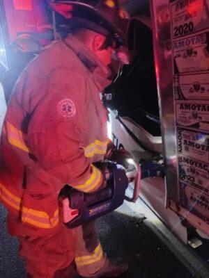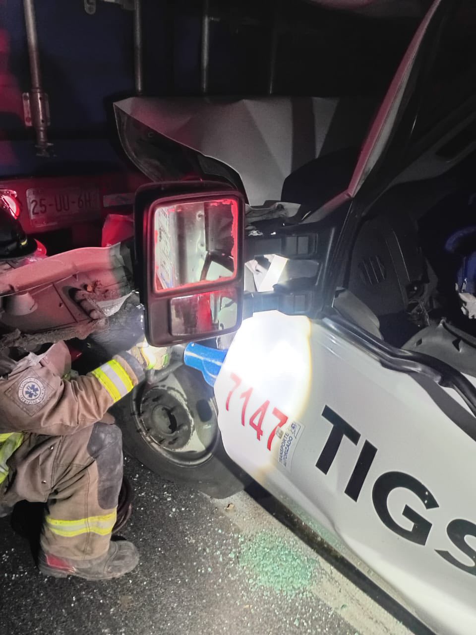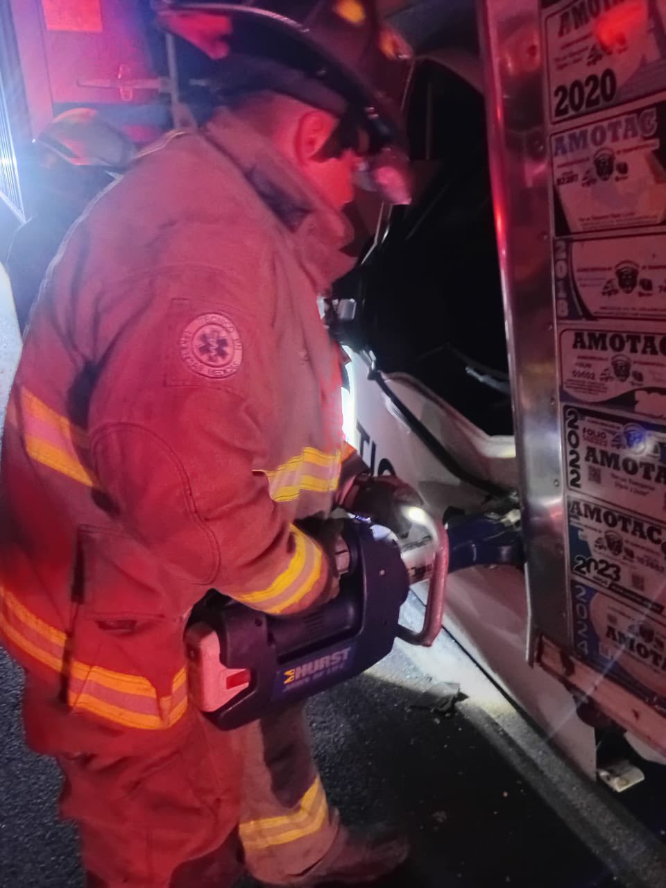 El conductor, un hombre de 72 años, quedó prensado dentro de la cabina, por lo que personal de rescate efectuó maniobras de extracción vehicular. Para su liberación fue necesario retirar la puerta del lado del chofer utilizando equipo hidráulico, permitiendo su rescate de manera segura.