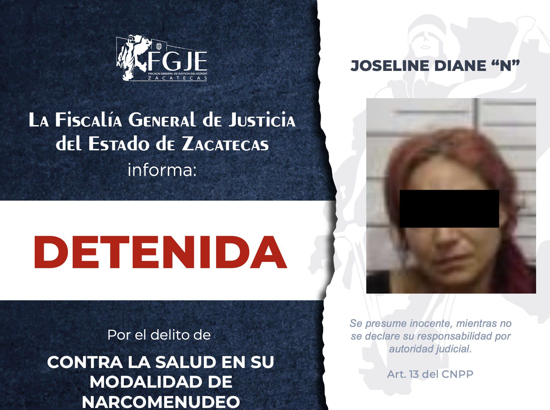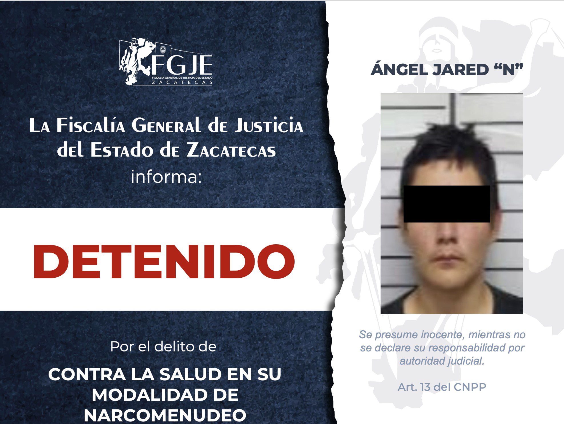 De acuerdo con la información oficial, Joseline Diane “N” y Ángel Jared “N” fueron localizados en el municipio de Zacatecas y contaban con órdenes de aprehensión por delitos contra la salud en su modalidad de narcomenudeo. Asimismo, Guillermo “N” fue detenido en la misma demarcación por una orden de aprehensión relacionada con el delito de secuestro agravado.