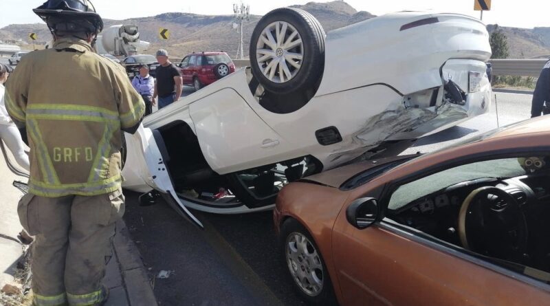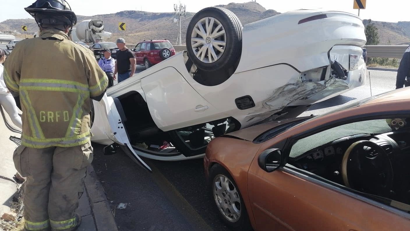 Elementos de Protección Civil Estatal atendieron un accidente vehicular múltiple con volcadura registrado el pasado 10 de enero en el libramiento de tránsito pesado, donde se vieron involucrados tres vehículos, uno de los cuales terminó volcado.