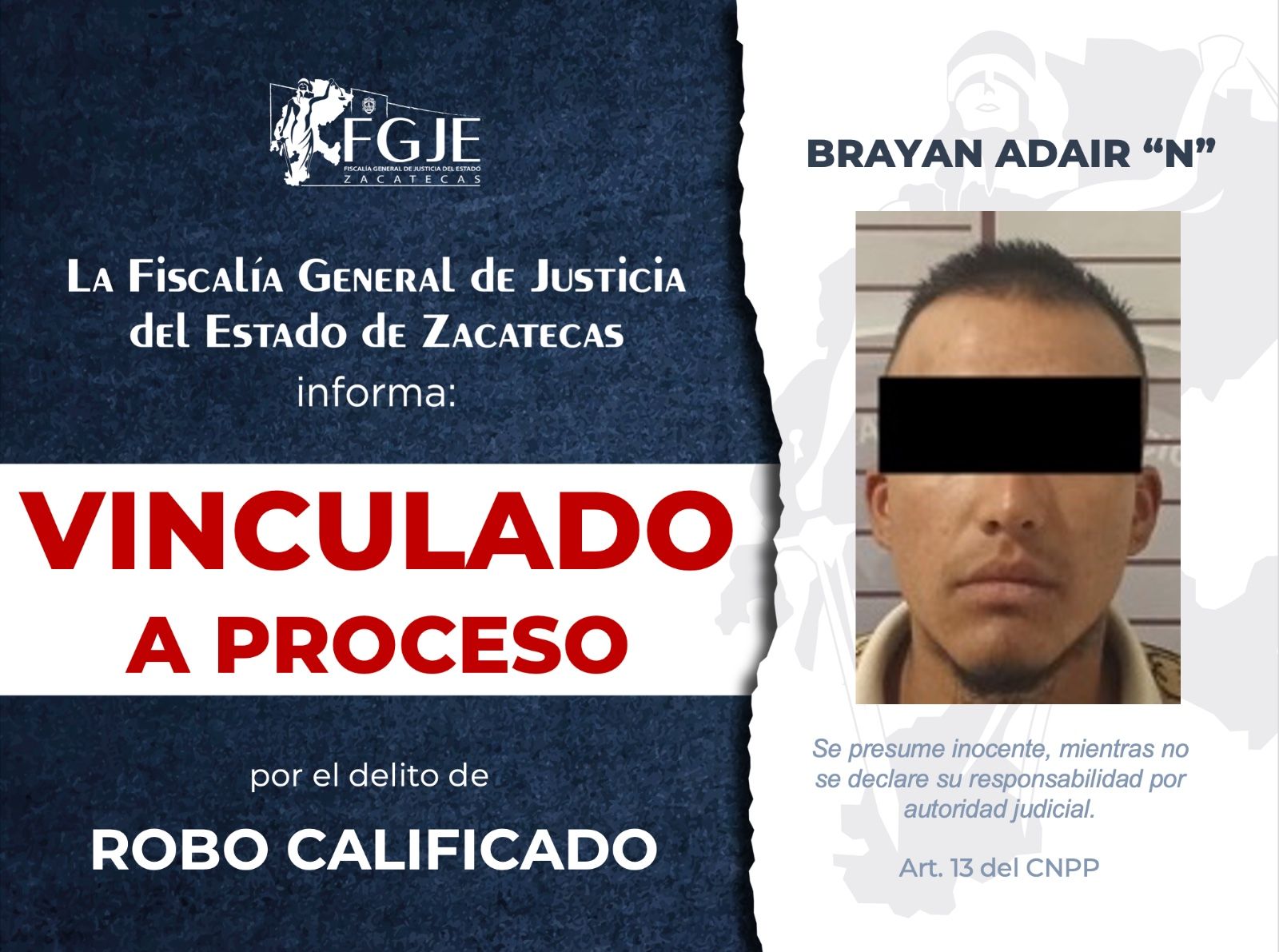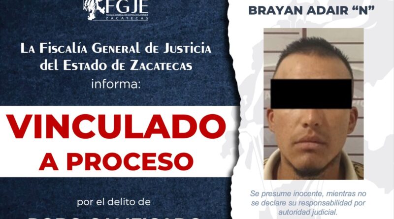 Zacatecas, Zacatecas. – La Fiscalía General de Justicia del Estado de Zacatecas informó que obtuvo la vinculación a proceso de Brayan Adair N por su probable responsabilidad en el delito de robo calificado, en agravio de dos personas, además de que se le impuso la medida cautelar de prisión preventiva.