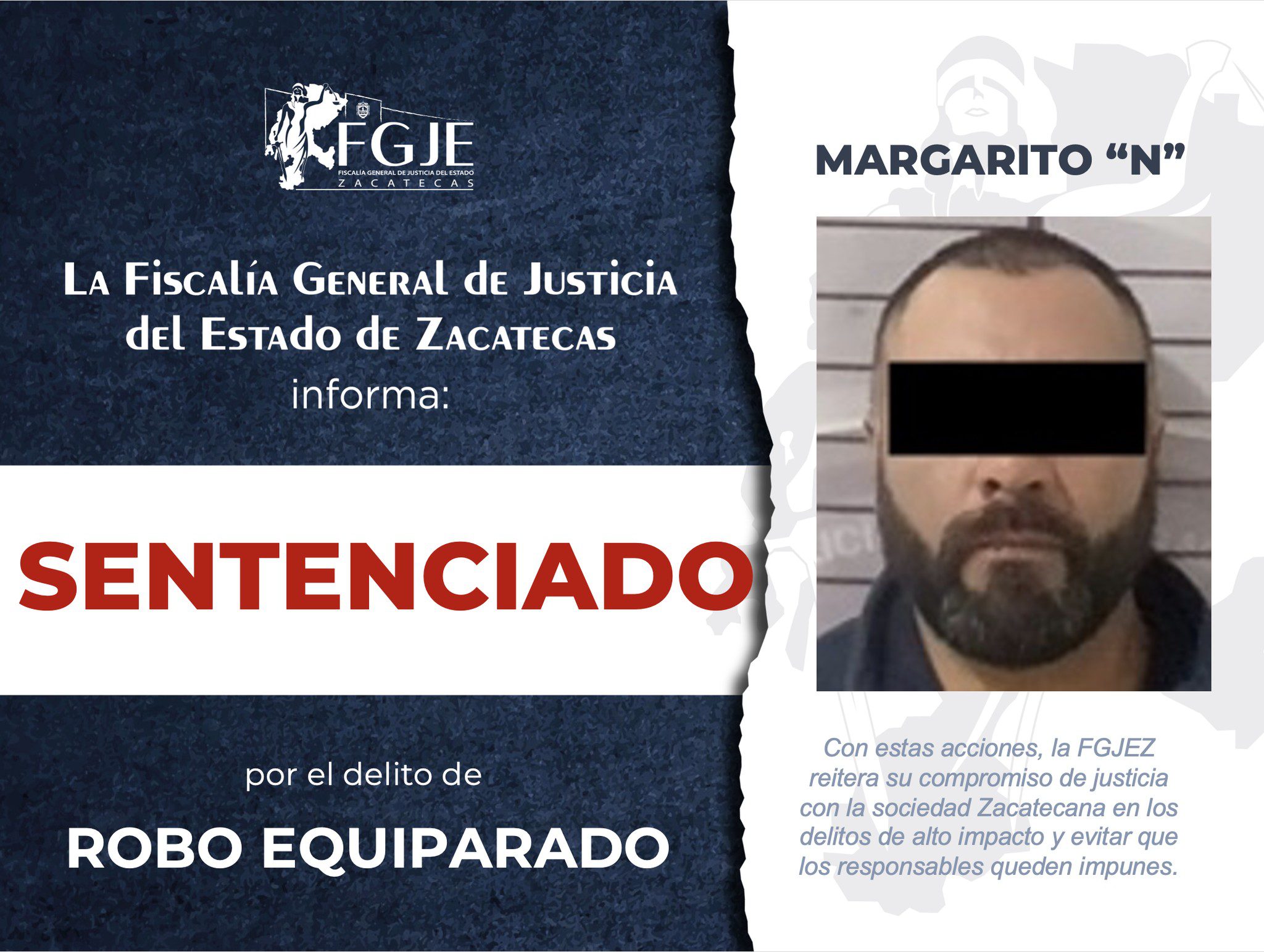 De acuerdo con la información oficial, Margarito N fue sentenciado a cuatro años de prisión, además de la reparación integral del daño a la víctima. Los hechos se registraron en enero de 2025, en el municipio de Fresnillo, cuando el hoy sentenciado fue detenido mientras circulaba a bordo de un vehículo que, tras una revisión, se confirmó contaba con reporte de robo vigente.