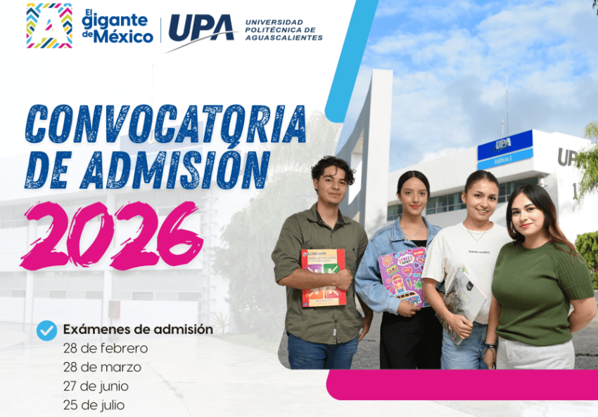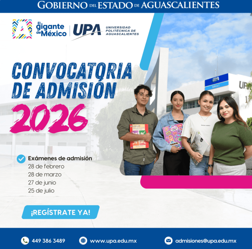 ¿Estás por egresar del bachillerato y te interesa estudiar una carrera del futuro con mayores oportunidades laborales? La Universidad Politécnica de Aguascalientes (UPA) abre su proceso de admisión 2026, el cual estará disponible hasta el 17 de julio del presente año, o bien, hasta agotar los lugares disponibles. El registro deberá realizarse a través del sitio web www.upa.edu.mx.