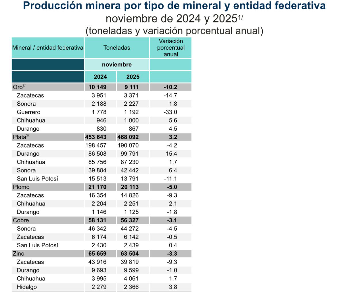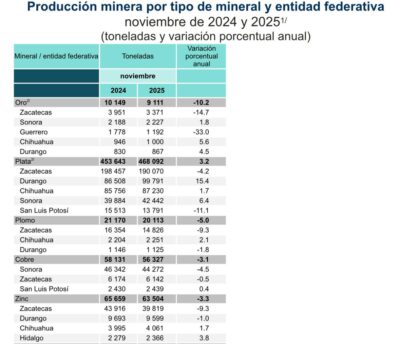 En el caso del plomo, Zacatecas alcanzó una producción de 14 mil 826 toneladas, mientras que en zinc se reportaron 39 mil 819 toneladas, con lo que se consolida su papel estratégico en el sector minero a nivel nacional.