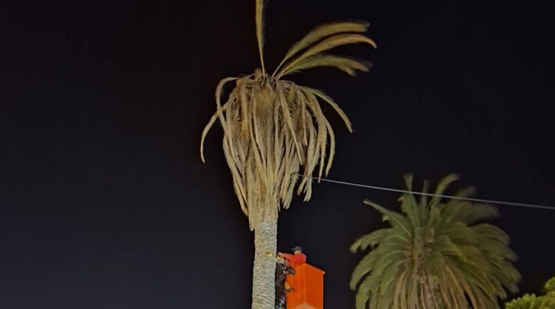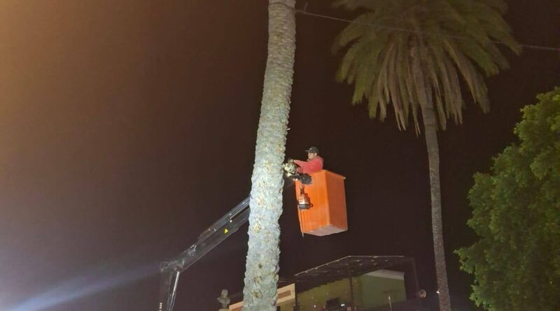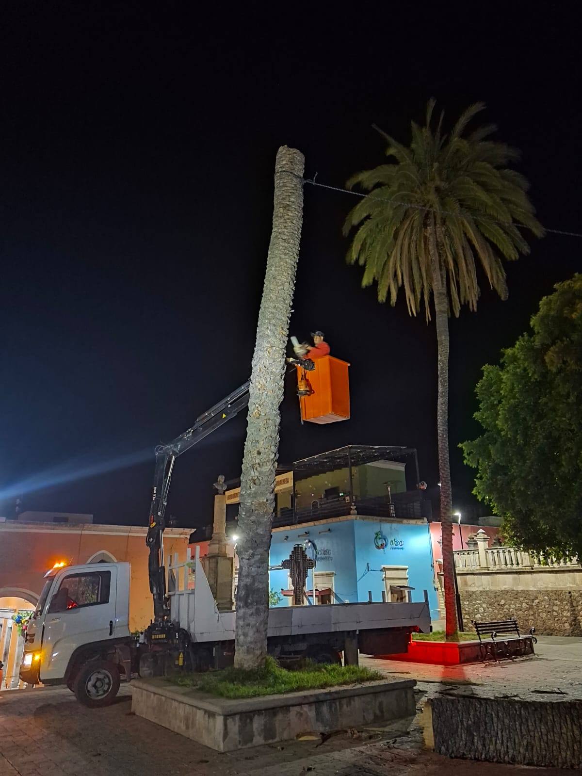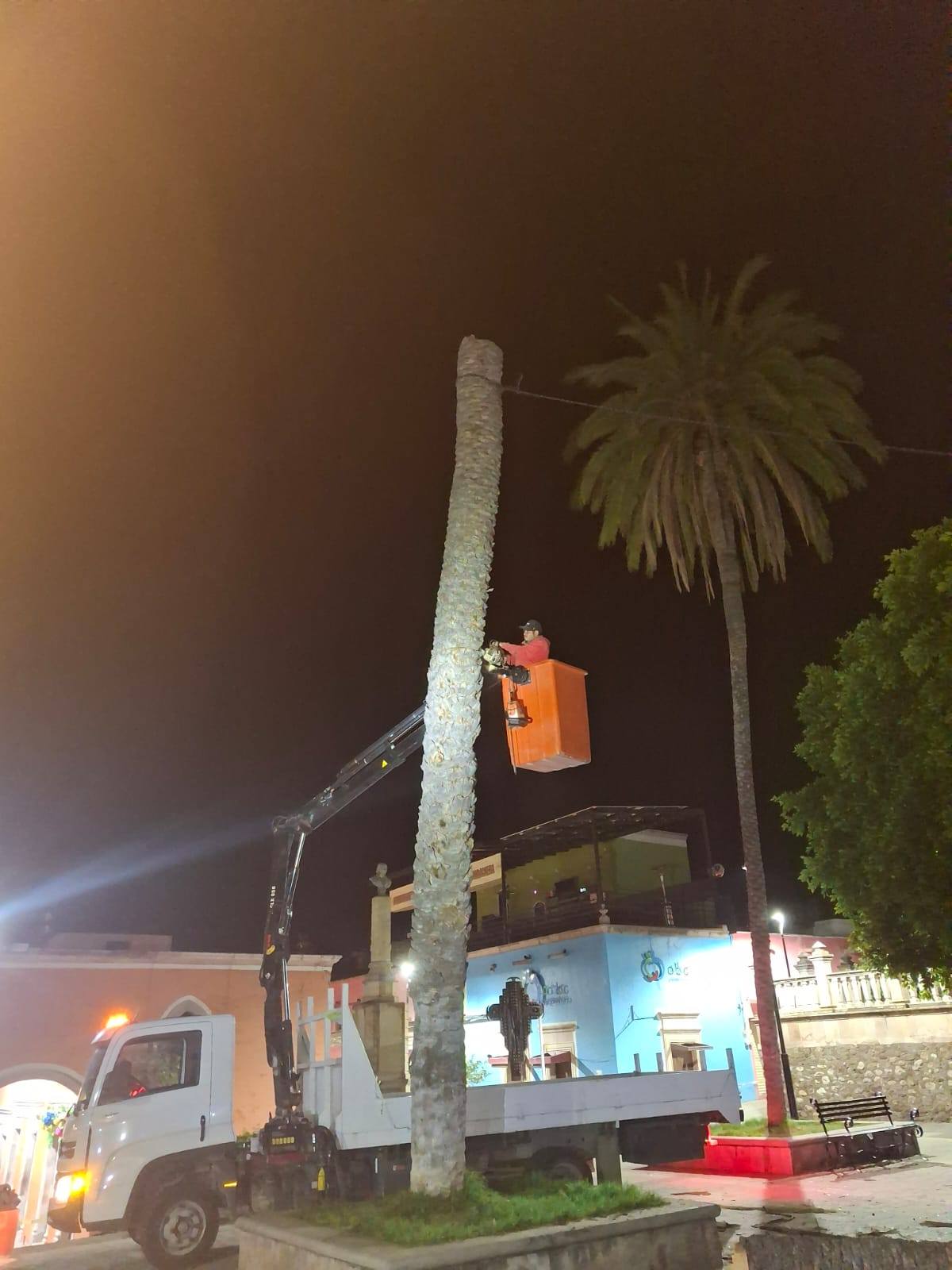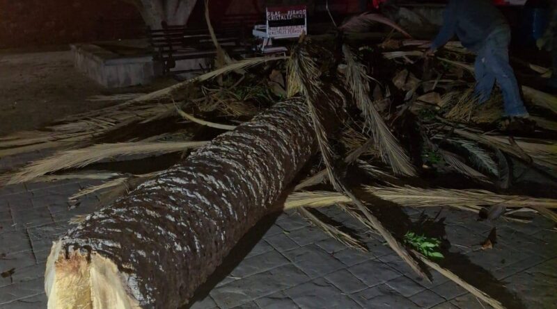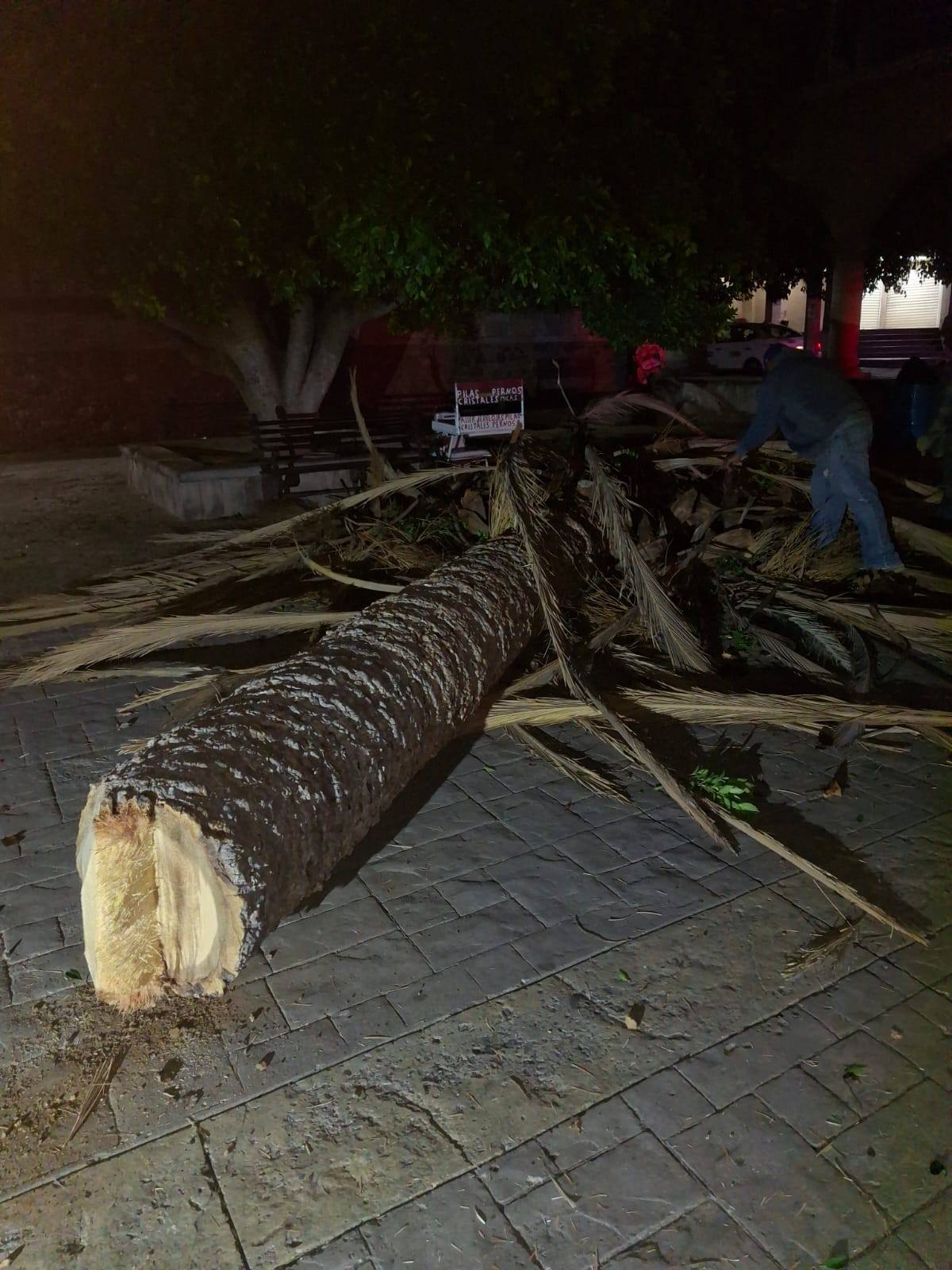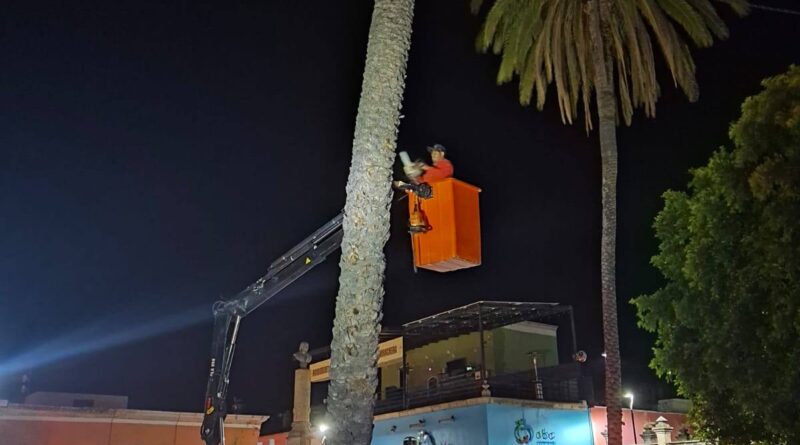 Calvillo, Aguascalientes.- Con el objetivo de proteger la integridad de la ciudadanía y prevenir accidentes, el Gobierno de Calvillo, a través de la Secretaría de Servicios Públicos, llevó a cabo el retiro de una palma ubicada en la Plaza Principal, la cual presentaba un daño severo provocado por una plaga que la afectó desde el interior.
