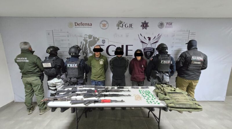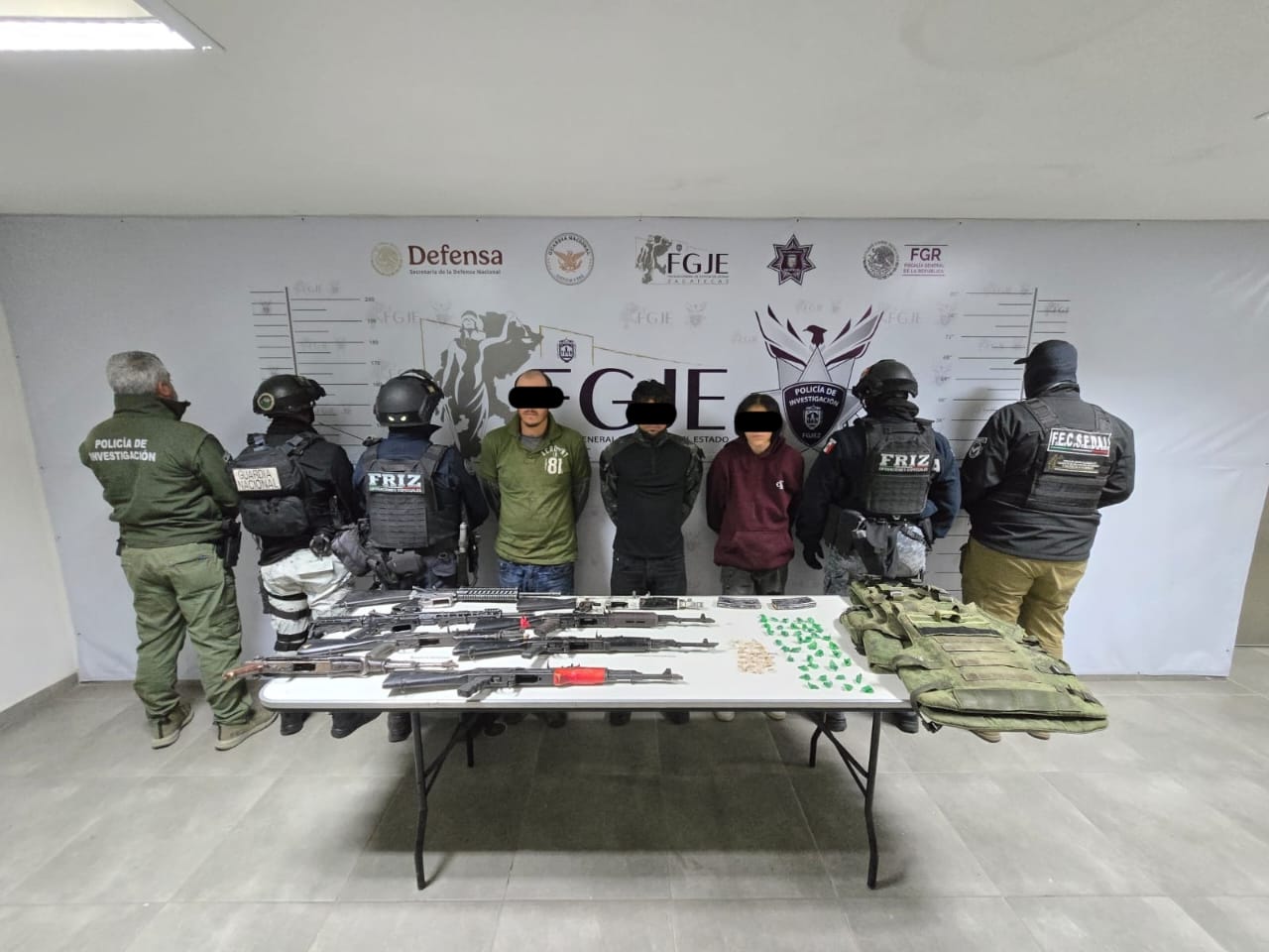Tabasco, Zac., 25 de enero de 2026.- En una acción contundente contra la delincuencia organizada, elementos de las Fuerzas de Reacción Inmediata Zacatecas (FRIZ), en coordinación con el Ejército Mexicano, Guardia Nacional y Policía de Investigación de la Fiscalía General de Justicia del Estado de Zacatecas (FGJEZ), lograron la detención de tres personas, probables integrantes de una célula criminal, así como el aseguramiento de armamento, explosivos y diversas sustancias ilícitas, en el municipio de Tabasco.