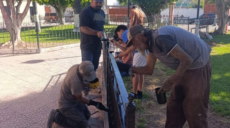 Entre las labores realizadas destaca la instalación de barandales en la parte baja del kiosco de la plaza, así como el apoyo con pintura para barandales y bancas, cuya aplicación fue realizada con la mano de obra del delegado de la comunidad, fomentando la participación local.