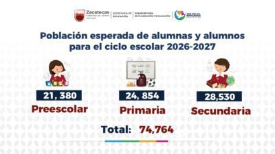 Zacatecas, Zac., 27 de enero de 2026.- Con el interés de que cada infante y adolescente en el estado tenga la oportunidad de ingresar a las aulas para su formación académica, la administración estatal, encabezada por el Gobernador David Monreal Ávila, pone a disposición de las niñas, niños y adolescentes más de 74 mil 764 espacios en Educación Básica.