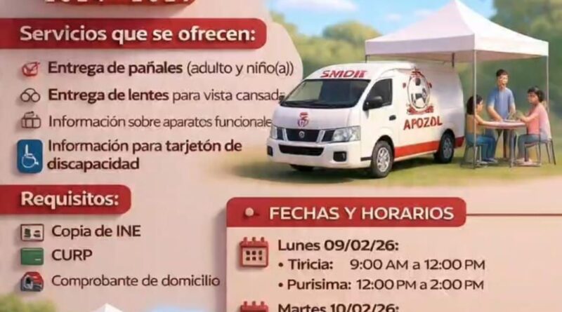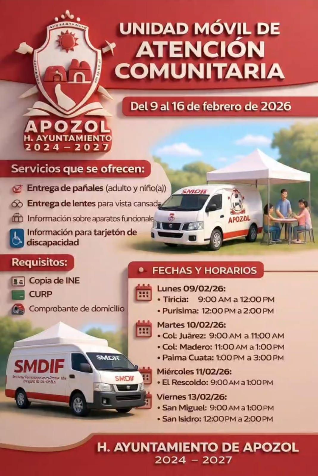 Apozol, Zacatecas.- Con el objetivo de acercar servicios y apoyos a la población, el Sistema Municipal DIF de Apozol llevará a cabo la jornada de la Unidad Móvil de Atención Comunitaria, del 9 al 16 de febrero de 2026, en distintas comunidades y colonias del municipio.