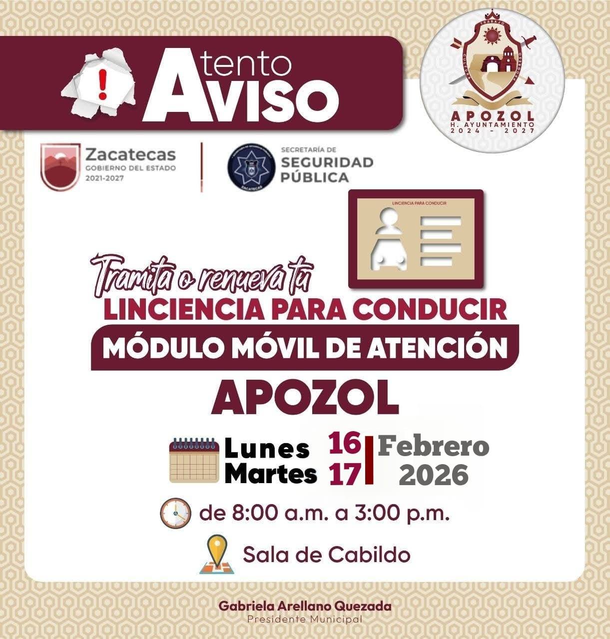Apozol.– El H. Ayuntamiento de Apozol, que encabeza la alcaldesa Gabriela Arellano, informó que en coordinación con la Secretaría de Seguridad Pública del Estado de Zacatecas se instalará un módulo móvil para el trámite de licencias de conducir.