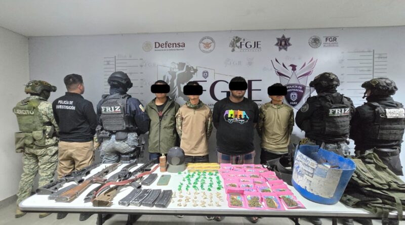 Tepechitlán, Zac., 17 de febrero de 2026.- Tras una agresión registrada en el municipio de Tepechitlán, las Fuerzas de Seguridad de los tres órdenes de Gobierno desarticularon una célula delictiva, mediante un operativo coordinado que permitió la detención de cuatro masculinos y el aseguramiento de armamento, explosivos, droga y diversos vehículos.