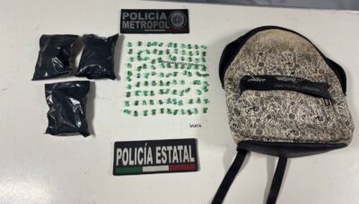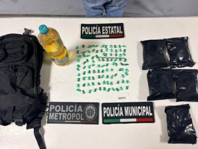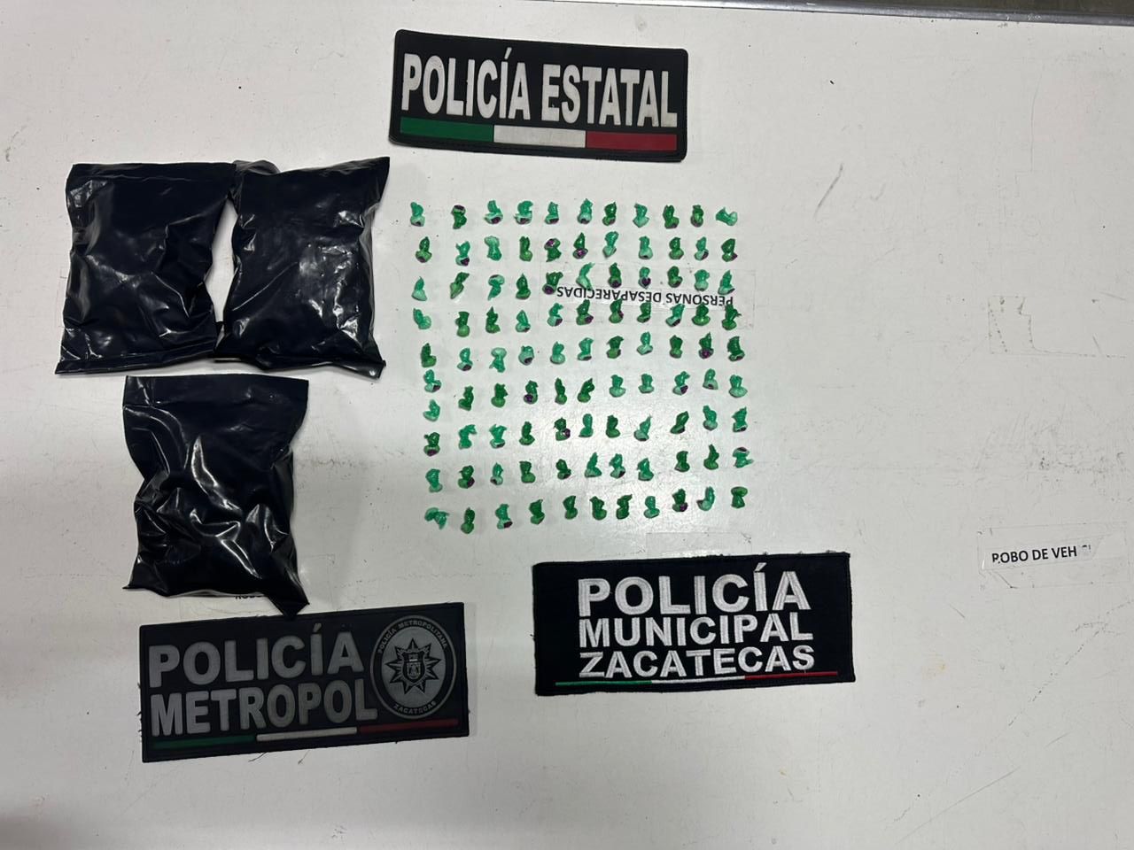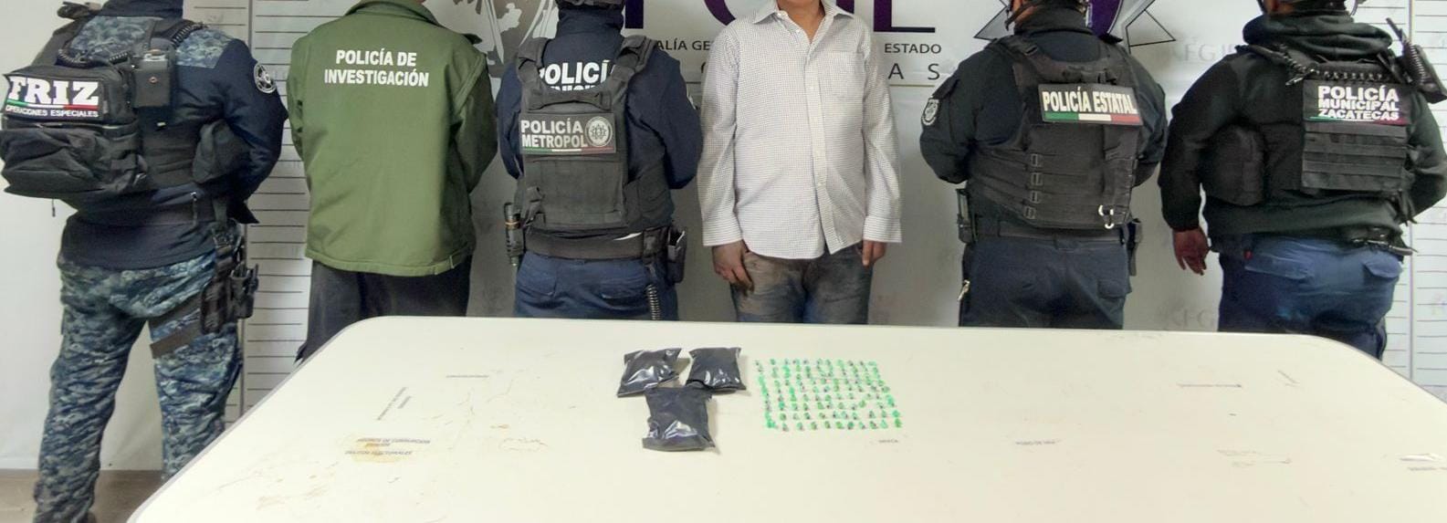 Derivado de estos hechos y como parte de las acciones de seguimiento, en la colonia González Ortega, elementos de la Policía Estatal Preventiva, Policía Municipal y Policía Metropolitana detuvieron a Arturo N., de 48 años, a quien, tras una inspección, se le aseguraron 100 envoltorios con sustancia con características de cristal y diversas bolsas con hierba verde y seca con características de marihuana.