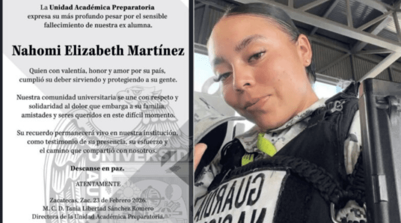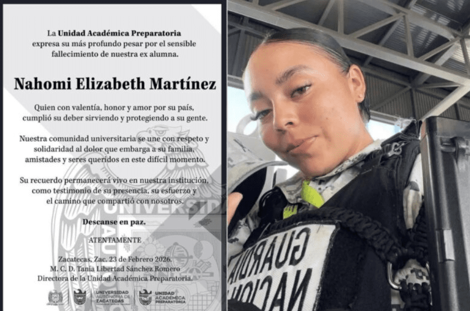 Zacatecas.– La entidad se encuentra de luto tras confirmarse el fallecimiento de Naomi Elizabeth Martínez, joven orgullosamente zacatecana e integrante de la Guardia Nacional, quien perdió la vida mientras participaba en un operativo federal realizado en el estado de Jalisco.