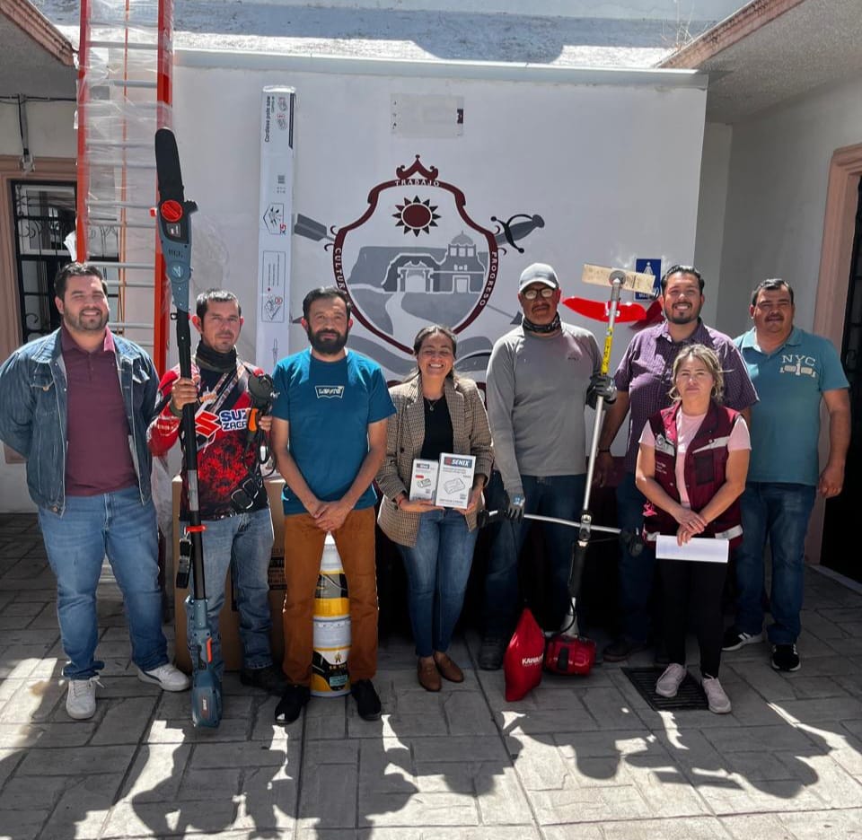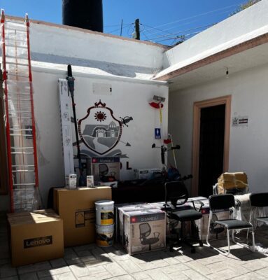 Entre el material entregado se incluyen equipos de cómputo, mobiliario de oficina, aires acondicionados, sillas, herramientas de trabajo, sopladoras, pulidoras, llantas y diverso equipamiento operativo, destinado a dependencias como Oficialía Mayor, Seguridad Pública, Tesorería, Desarrollo Económico, Obras y Servicios Públicos, así como áreas administrativas.