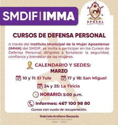 Apozol, Zacatecas.– En el marco del Día Internacional de la Mujer, el Gobierno Municipal de Apozol 2024–2027, a través del Instituto Municipal de la Mujer Apozolense (IMMA) del SMDIF, invita a las mujeres del municipio a participar en los cursos de defensa personal que se impartirán en distintas comunidades.