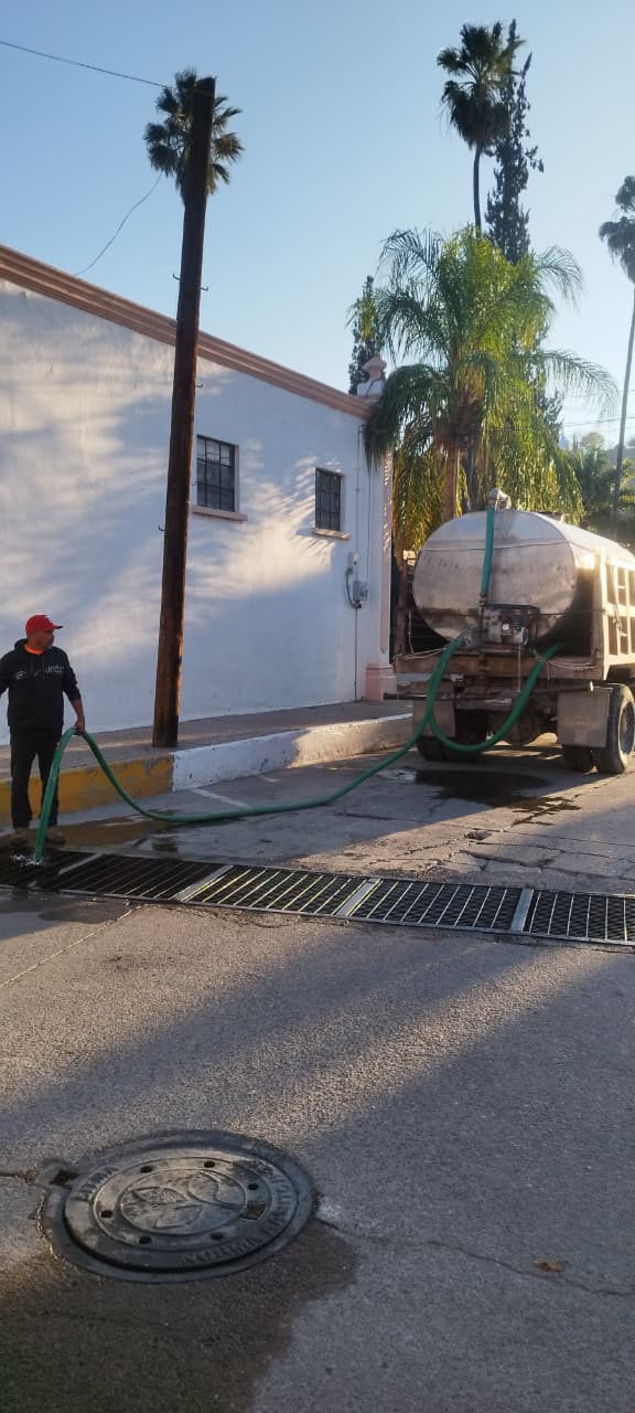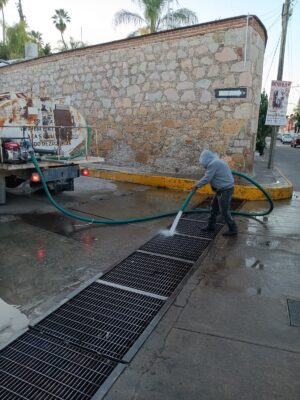 Las labores incluyeron la aplicación de agua clorada para la sanitización de estos espacios, lo que permite mejorar el funcionamiento del sistema pluvial y contribuir al cuidado de la salud pública.