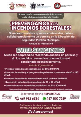 Las autoridades recordaron que estas disposiciones se encuentran establecidas en el Bando de Policía y Buen Gobierno del Municipio de Apozol, por lo que el incumplimiento puede derivar en sanciones económicas.
