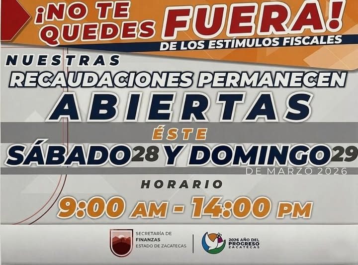 Zacatecas, Zac., 27 de marzo de 2026.- En el marco del 2026, Año del Progreso, el Gobierno de Zacatecas, encabezado por el mandatario estatal David Monreal Ávila, a través de la Secretaría de Finanzas, informa que el sábado 28 y domingo 29 de marzo todas las oficinas de Recaudación de Rentas de la entidad brindarán servicio en un horario extraordinario de 9:00 a 14:00 horas, con excepción de la oficina ubicada en el municipio de Atolinga.