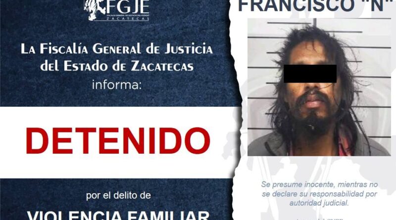 De acuerdo con la información oficial, Juan Francisco “N” fue detenido en el municipio de Guadalupe por su probable responsabilidad en los delitos de violencia familiar agravada y lesiones.