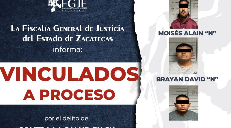 Fresnillo, Zacatecas.– La Fiscalía General de Justicia del Estado de Zacatecas (FGJEZ), a través de su Fiscalía de Alto Impacto, obtuvo la vinculación a proceso de tres personas por su probable responsabilidad en delitos contra la salud en su modalidad de narcomenudeo.